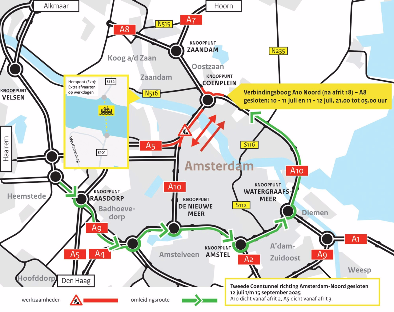 Van 12 juli tot en met 15 september is de 2e Coentunnel (A10) richting Amsterdam Noord gesloten vanwege werkzaamheden. Verkeer kan niet door de tunnel van Amsterdam West naar Amsterdam Noord.