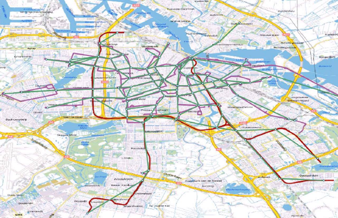 In onderstaand voorbeeld geven we de segmenten voor trams en metro’s met groene lijnen weer. De segmenten worden bovenop het feitelijke lijnennet getoond. De rode lijnen duiden het metronetwerk aan, de paarse het tramnetwerk.