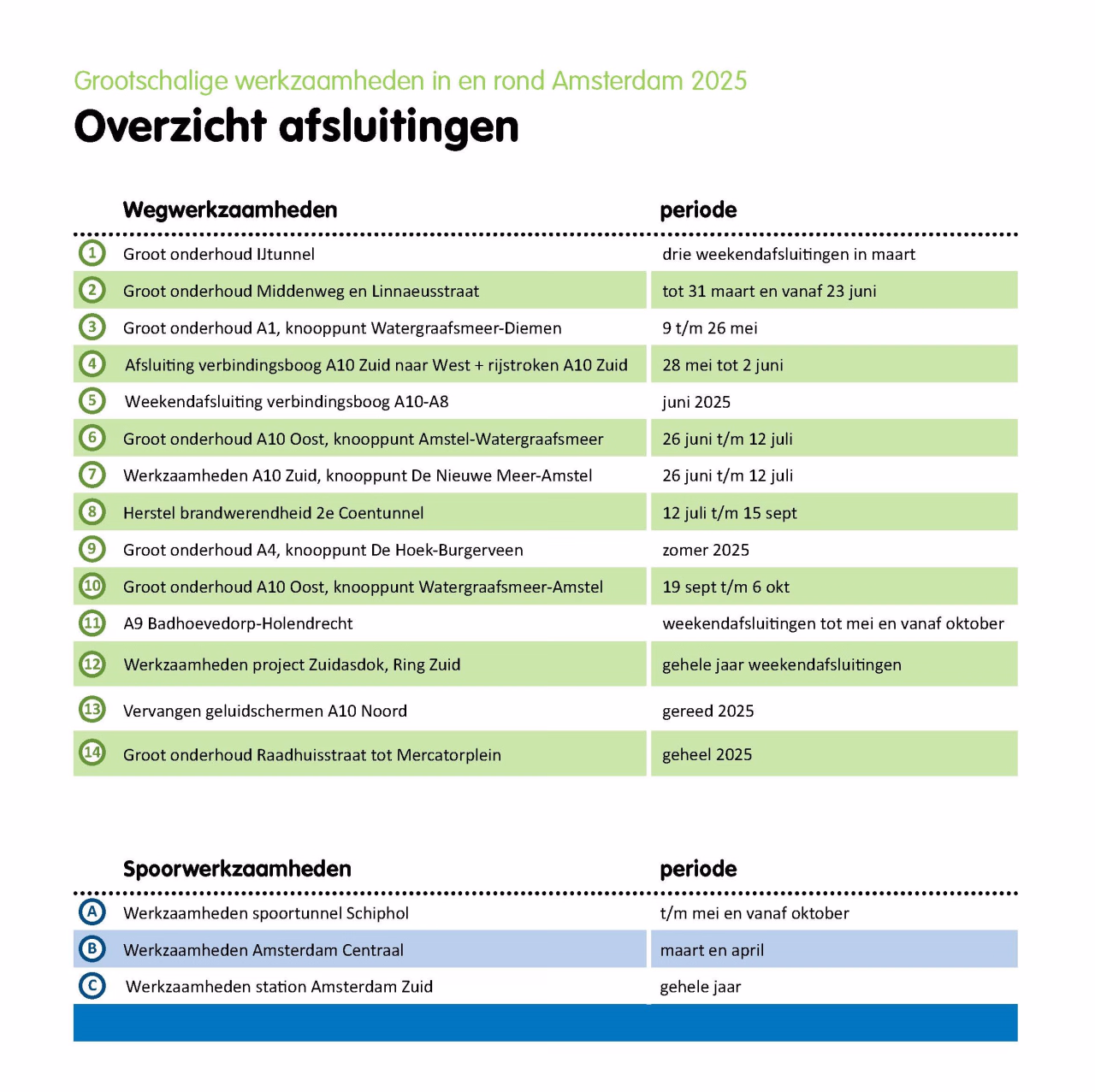Rijkswaterstaat, gemeente Amsterdam en ProRail werken het hele jaar op verschillende plekken in en rond Amsterdam, met een piek tussen mei en oktober. Rijkswaterstaat werkt dan onder andere aan de Ring A10 van Amsterdam, de A1 en A4, gemeente Amsterdam aan de Middenweg/Linnaeusstraat en ProRail aan Amsterdam Centraal. Ook vinden er grote evenementen plaats waardoor er veel bezoekers richting of door de regio zullen komen, zoals het Festival op de Ring voor 750 jaar Amsterdam, waarvoor een deel van de A10 wordt afgesloten, SAIL en de NAVO-top in Den Haag. Daarnaast werkt Rijkswaterstaat nog het hele jaar op de A9 tussen Badhoevedorp en Holendrecht en Ring A10 Zuid project Zuidasdok, waardoor er verschillende weekenden afsluitingen zijn. Ook werkt ProRail aan het spoor, waardoor NS op bepaalde trajecten een aangepaste dienstregeling rijdt.