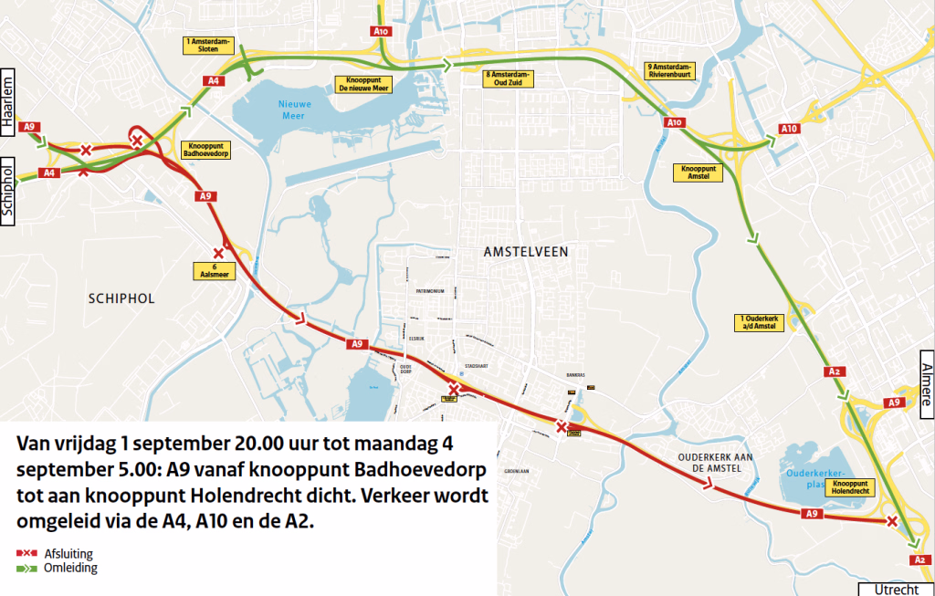 Van vrijdag 1 september 20.00 tot maandag 4 september 2023 05.00 uur is de A9 richting Amsterdam/Utrecht dicht, vanaf knooppunt Badhoevedorp tot aan knooppunt Holendrecht (1 rijrichting). Verkeer vanuit Schiphol/Haarlem, richting Amsterdam of Utrecht moet rekening houden met 10 tot 30 minuten extra reistijd.