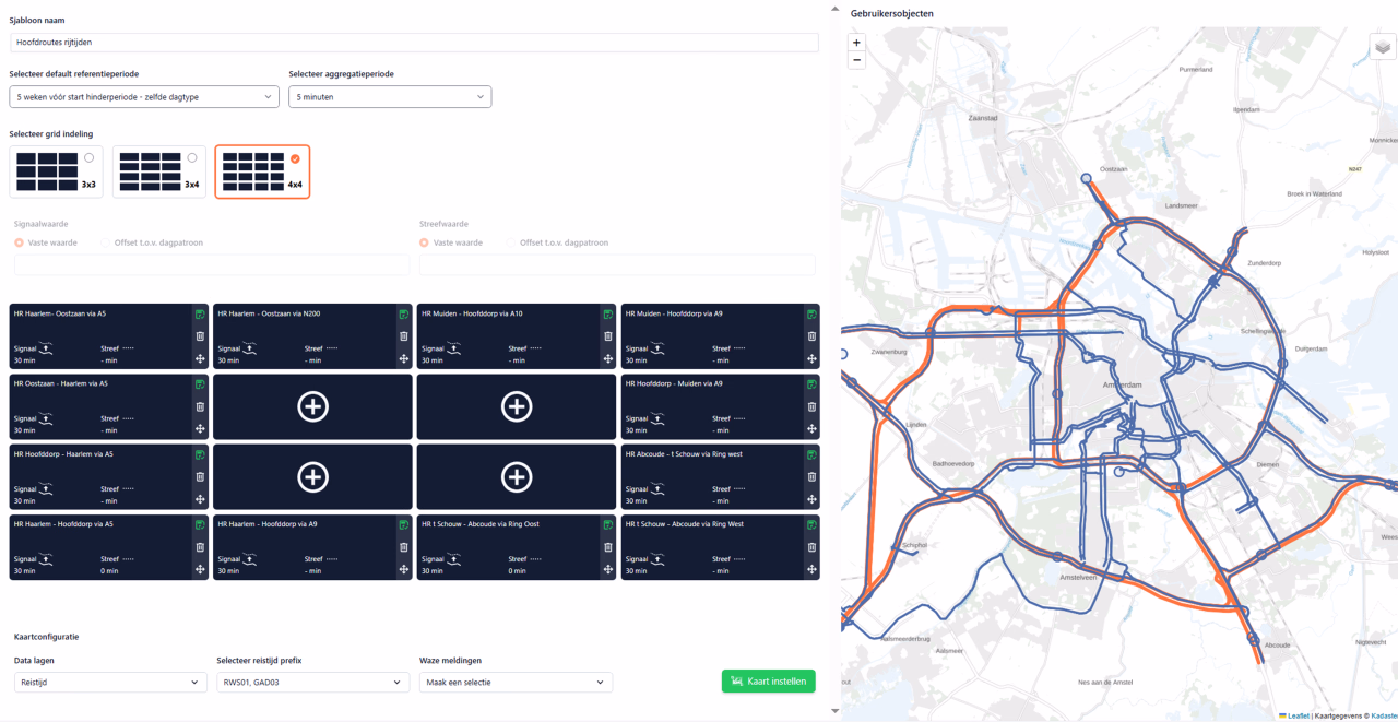 - Prestatie-indicator: geef aan wanneer de prestatie van de meetresultaten voor jouw toepassing nog aanvaardbaar is. Voor routes kun je bijvoorbeeld instellen welke extra reistijd je nog acceptabel vindt: in absolute zin (een bepaald aantal minuten extra reistijd) of in relatieve zin (een reistijdfactor). Ook het aantal minuten of de omvang van de reistijdfactor kun je zelf bepalen. Stel voor telpunten bijvoorbeeld een percentage in waarbij sprake is van een significante groei of afname