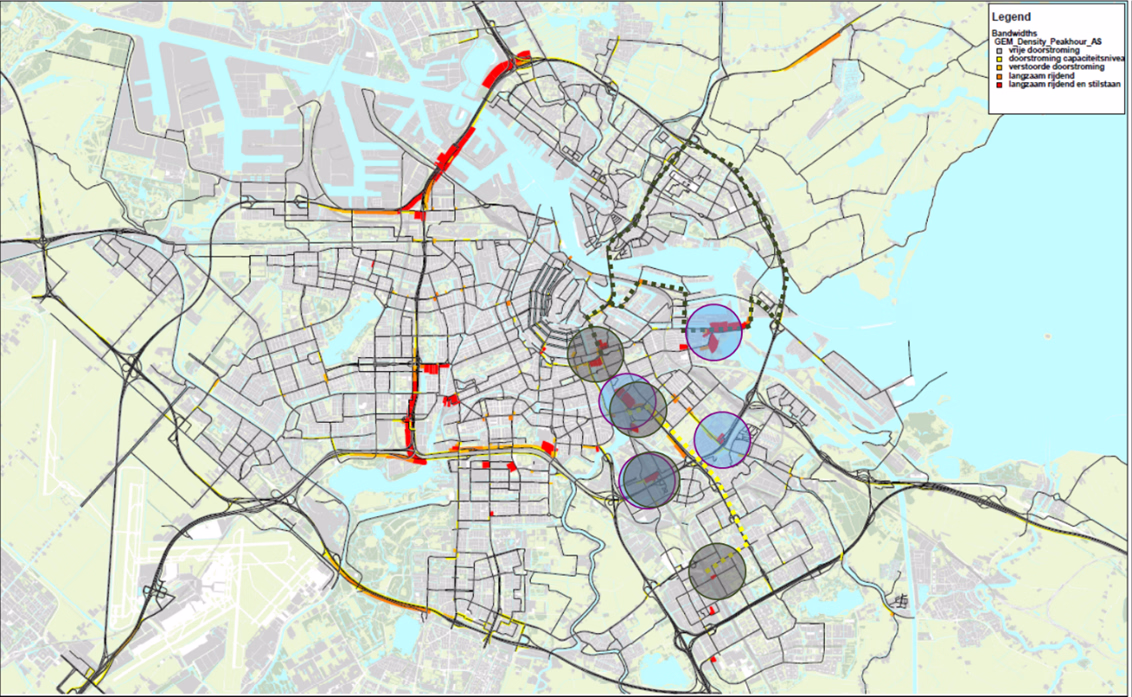 Als dat nodig is, voeren we ook een modelrun uit met het Tactisch Model Amsterdam, een zogenaamd macroscopisch-dynamisch verkeersmodel. Dit geeft extra inzicht in het gecombineerde hindereffect van diverse projecten die gelijktijdig op het wegennetwerk worden uitgevoerd. Hieronder zie je de output van zo’n model.